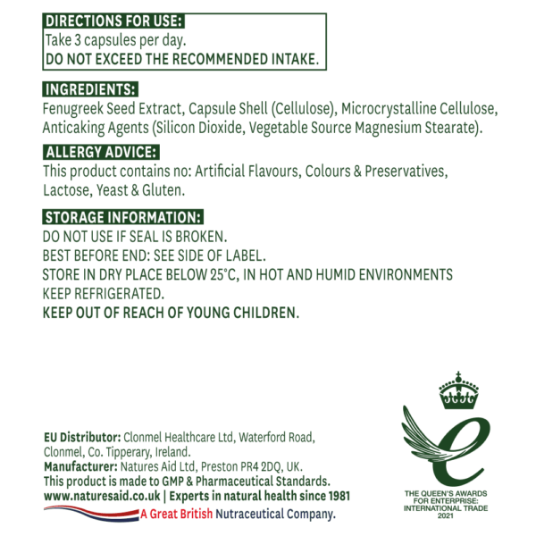 V podjetju Natures Aid so pripravili kapsulo Fenugreek 500 mg, ki je standardizirana tako, da zagotavlja 750 mg saponinov na dnevni odmerek. Prisotnost steroidnih saponinov diosgenina, jamogenina, tigogenina in neotigogenina naj bi bila vzrok za številne koristne učinke Fenugreek.