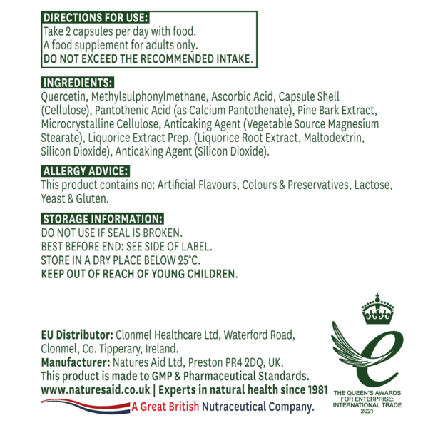 Skrbno uravnotežena formula kvercetina z vitaminom B5, izvlečkom borovega lubja, MSM in sladkim korenom. Kvercetin je rastlinski pigment ali flavonoid, ki ga najdemo v rastlinah, vključno s čebulo, jabolki, jagodičevjem in tudi v rdečem vinu. Edinstvena formula v Natures Aid združuje kvercetin s sinergističnimi hranili, vključno z vitaminoma C in B5.