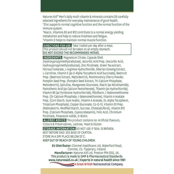 Natures Aid Multi-vitamini & minerali za moške vsebujejo 29 skrbno izbranih sestavin za ohranjanje zdravja moških.
