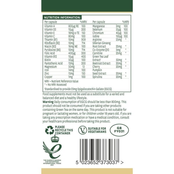 | Sestava | magnezijev citrat, kapsula (hidroksipropilmetilceluloza), pripravek askorbinske kisline. (askorbinska kislina, hidroksipropilmetilceluloza), cinkov pikolinat, izvleček zelenega čaja, železov fumarat, L-arginin hidroklorid, izvleček sibirskega ginsenga, L-karnitin, vitamin E (kot d-alfa-tokoferol kislinski sukcinat), pripravek rdeče pese (izvleček rdeče pese, maltodekstrin), češnja Montmorency v prahu, pripravek iz bučnih semen (izvleček bučnih semen, trikalcijev fosfat, maltodekstrin), spirulina, manganov glukonat, niacin (kot nikotinamid), pantotenska kislina (kot kalcijev pantotenat), tiamin (kot hidroklorid), vitamin B6 (kot piridoksin hidroklorid), riboflavin, pripravek selena (di-kalcijev fosfat, l-selenometionin), pripravek vitamina A (koruzni škrob, arabski gumi, vitamin A acetat, DL-alfa-tokoferol, trikalcijev fosfat), bakrov glukonat, Co-Q-10, pripravek vitamin D3 (maltodekstrin, modificiran škrob, saharoza, holekalciferol), pripravek vitamina B12 (kalcijev fosfat, cianokobalamin), folna kislina, kromov pikolinat, kalijev jodid, D-biotin. |
