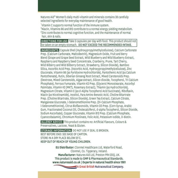 Natures Aid Multivitamini in minerali s superhrano za ženske vsebujejo 38 skrbno izbranih sestavin za vsakodnevno uporabo.