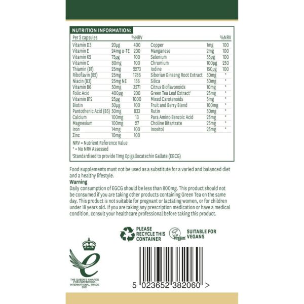 Multivitamini in minerali za ženske vsebujejo vitamin B6, ki pomaga uravnavati hormonsko aktivnost, in vitamin K2, ki skrbi za zdrave kosti. Veganom prijazno dnevno dopolnilo je razvila strokovna ekipa, da bi pomagala zagotoviti dopolnitev določenih ključnih hranil, zlasti kadar z zdravo in uravnoteženo prehrano ni mogoče dobiti vsega, kar telo potrebuje.
