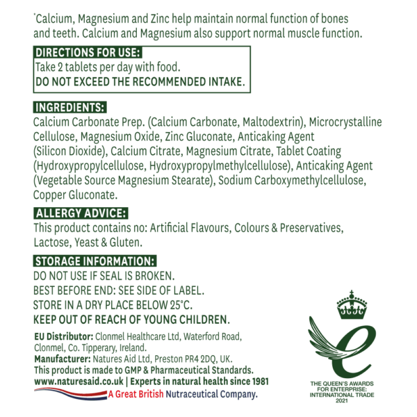 Natures Aid Kalcij, magnezij & vitamin D3 so ključni za ohranjanje zdravih kosti, zob in dobrega delovanja mišic.