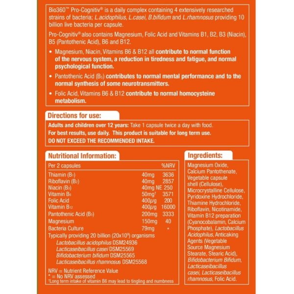 Prehransko dopolnilo Pro-Cognitiv ne potrebuje hlajenja in vsebuje vitamine B6, B12 in folno kislino, ki podpirajo normalno presnovo homocisteina. Magnezij podpira normalno delovanje vašega živčnega sistema, vitamin B5 pa podpira normalno duševno delovanje in proizvodnjo določenih vrst nevrotransmiterjev. Vitamin B1, niacin in folna kislina podpirajo normalno psihološko delovanje, vitamini B2, B6 in B12 pa pomagajo zmanjšati utrujenost in izčrpanost.