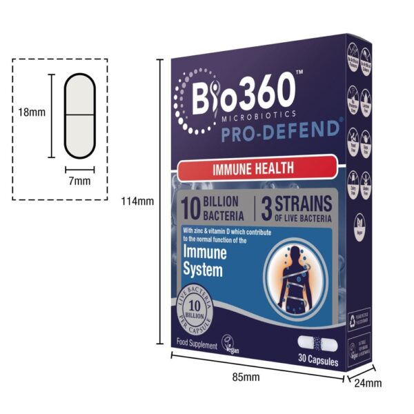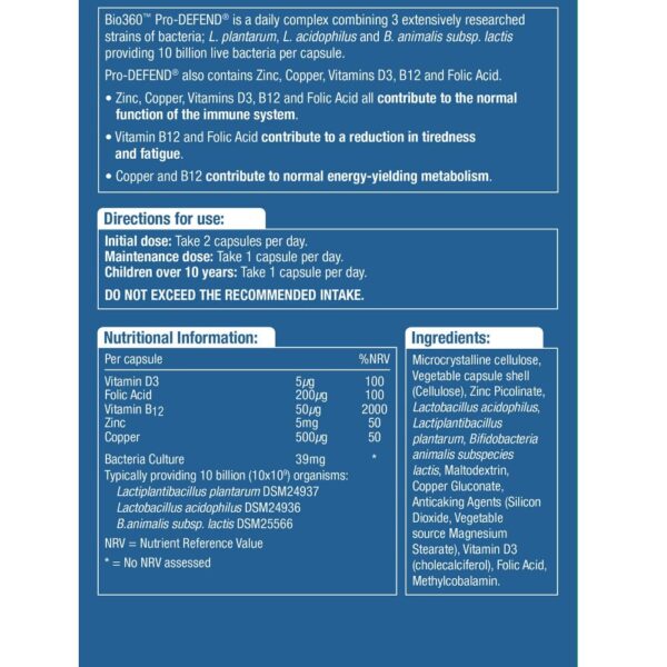 Pri ustvarjanju linije Bio360 je naša ekipa strokovnjakov uporabila obsežno količino razpoložljivih raziskav in ustvarila vrsto ciljno usmerjenih mikrobiotičnih prehranskih dopolnil. PRO-DEFEND vsebuje edinstveno mešanico posebej izbranih bakterij in skrbno izbranih hranil, kot je cink, ki podpirajo zdrav imunski sistem.