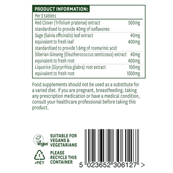 | Sestava | Izvleček rdeče detelje, di-kalcijev fosfat, mikrokristalna celuloza, pripravek sladkega korena (izvleček korenine sladkega korena, maltodekstrin), sredstvo proti sprijemanju (silicijev dioksid), natrijeva karboksimetilceluloza, izvleček žajblja, pripravek sibirskega ginsenga (izvleček sibirskega ginsenga, maltodekstrin, silicijev dioksid), sredstvo proti sprijemanju (magnezijeve soli maščobnih kislin rastlinskega izvora). |