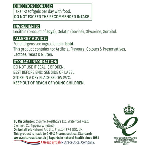 Kapsule Natures Aid Lecitin močna formula vsebujejo 1200 mg nebeljenega lecitina, pridobljenega iz naravno pridobljenih sojinih zrn, ki niso gensko spremenjena, ter ne vsebujejo laktoze in glutena.