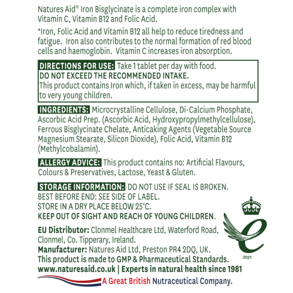 Natures Aid® Železov bisglicinat pomaga zmanjšati utrujenost in izčrpanost; omogoča normalno kognitivno funkcijo in celični metabolizem Z vitaminom C, ki je ključnega pomena za dobro absorpcijo.