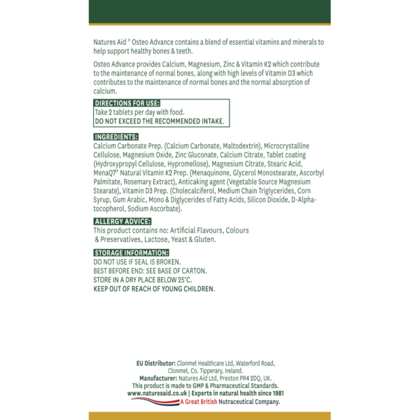 Naše prehransko dopolnilo OsteoAdvance je skrbno oblikovala naša ekipa prehranskih strokovnjakov, da bi vam pomagala zagotoviti kalcij, magnezij, vitamin D, cink in vitamin K2 za podporo zdravim kostem. Samo dve tableti na dan zagotovita priporočeni dnevni odmerek teh dragocenih hranil za podporo zdravim kostem in zobem.