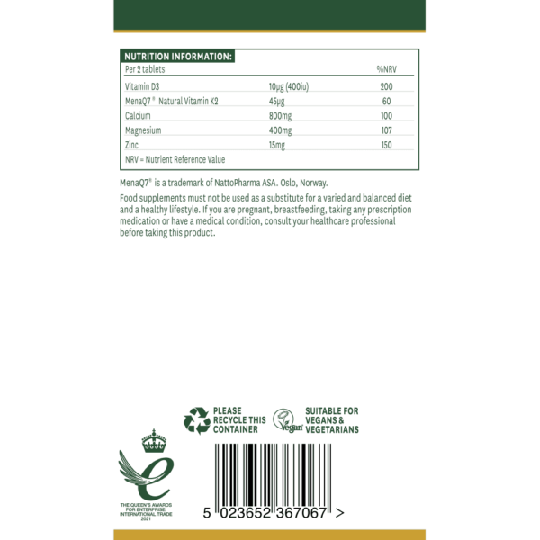 Vsebuje mešanico esencialnih mineralov in vitaminov, potrebnih za zdrave in močne kosti in zobe: kalcij, magnezij, cink ter vitamina K2 in D3.