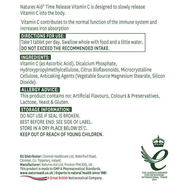 Pri Natures Aid so naši strokovnjaki skrbno oblikovali vitamin C s postopnim sproščanjem, tako, da vsaka tableta vsebuje 1000 mg vitamina C. Naša tableta je zasnovana tako, da se vitamin C počasi sprošča v vaše telo ves dan. Vsak dan pogoltnite eno vegansko tableto v celoti in jo zaužijte s hladnim napitkom. Lahko ste prepričani, da naš vitamin C s postopnim sproščanjem ne vsebuje barvil in arom ter GSO, glutena, kvasa, mlečnih izdelkov, oreščkov, soje, sladkorja ali sladil.
