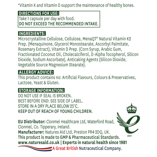 V podjetju Natures Aid so naši strokovnjaki skrbno pripravili vitamin K2 s klinično potrjeno in patentirano obliko vitamina K2, imenovano MenaQ7. MenaQ7 je primeren za vegane ter ne vsebuje glutena, mleka, soje in drugih pogostih alergenov. Prav tako naj bi bil najbolj bioaktivna oblika vitamina K2 na trgu in je bil uporabljen v številnih kliničnih preskušanjih, v katerih so preučevali potencialne koristi tega premalo znanega, a tako zelo pomembnega vitamina.